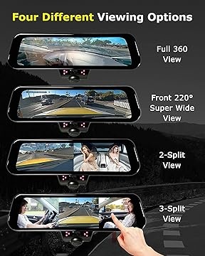 The 360 VIEW-SPL is a universal touchscreen 10-inch frameless rearview mirror with built-in dash cam/HD monitor with 360 surround video recording features. Users can then choose to display the front of the car, sides of the car and the rear seat, for monitoring passengers. Frameless Infinity Polished Edge Mirror Design for clean look, using optic bonding for monitor assembly with no air gap between the front glass and TFT screen for ultra-high brightness, and high color contrast viewing. Includes an auto sensing photo sensor for TFT screen brightness control, so automatically set to maximum brightness during daytime and less bright during night. Users can swipe left and right on the mirror to view the particular perspective they wish to see, with split screen views of multiple angle options, 360 VIEW-SPL can show a 360-degree view simultaneously on all multiple view selections for complete viewing coverage.